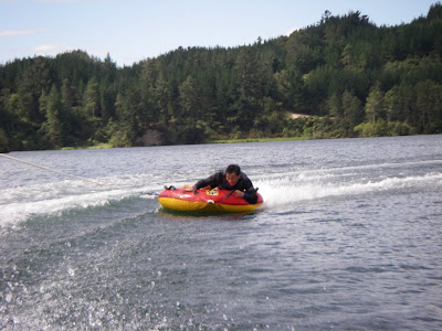 I am not a fan of these things. Firstly, I hate kneeling (it's not an anti-religious stance or anything, I just find it really uncomfortable!). The cool thing is that you can tow quite a few of these behind one boat (we had five at one point) and have "kneeboard" wars, but if you're the first to fall off it can be quite a while before the boat comes back to pick you up!! Even though I look like I might be enjoying myself I'm always glad to get off and try something else like.... the biscuit!